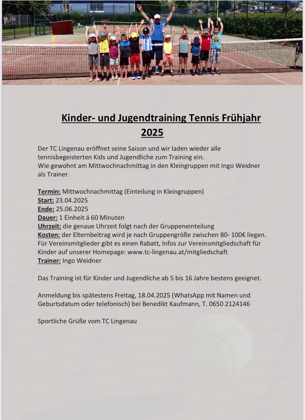 Meldet eure tennisbegeisterten Kids (5–16 Jahre) für unser Frühjahrs-Training an – immer mittwochs mit unserem erfahrenen Trainer Ingo Weidner.