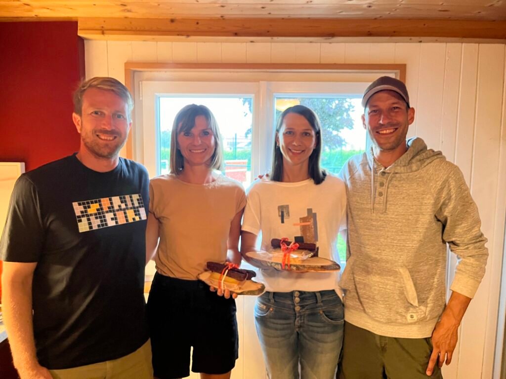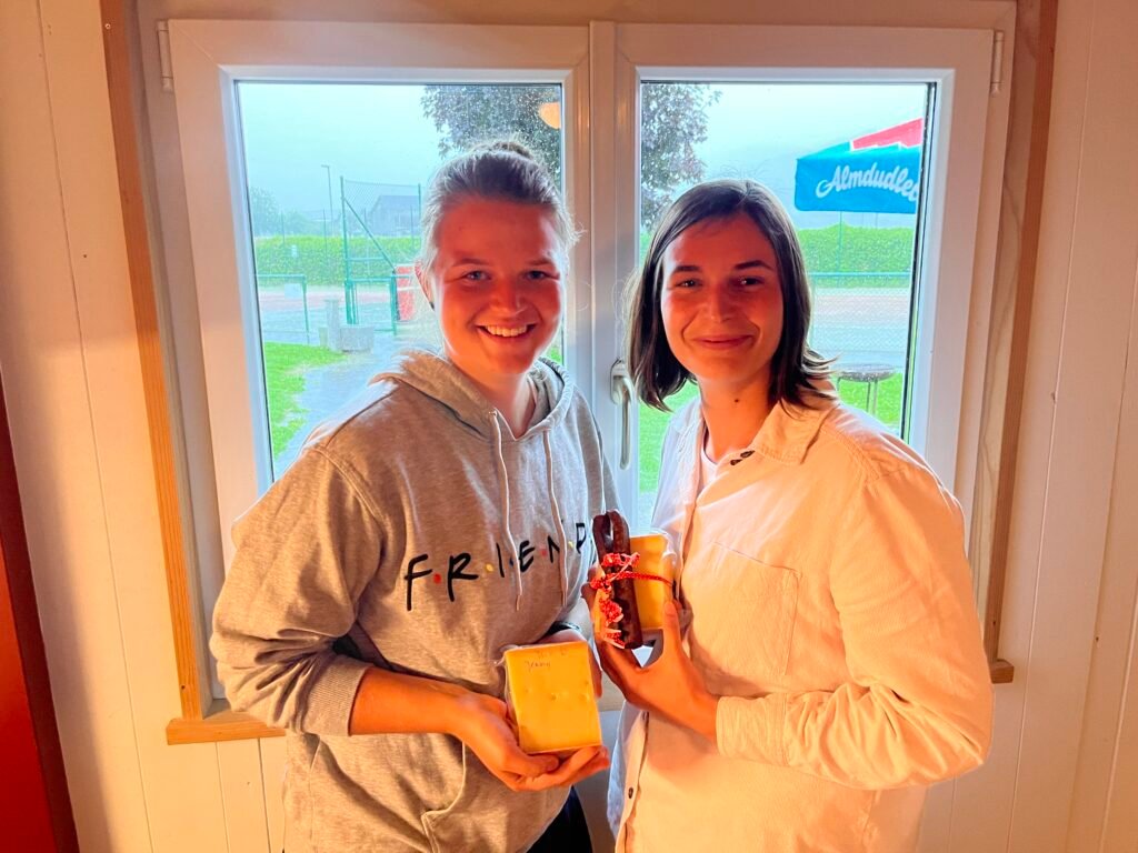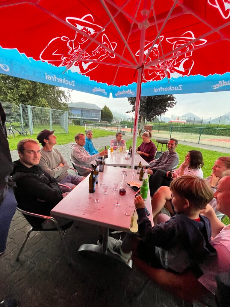 Auch nach den Matches ließ uns das schlechte Wetter nicht die Stimmung verderben. Alle, einschließlich Familien mit Kindern, versammelten sich im Clubheim zur feierlichen Siegerehrung durch unsere Clubobfrau Marina Nenning. Herzlichen Dank an Frank Timmers und das Familien Hotel Adler in Lingenau für das großzügige Sponsoring – wir genossen leckeres Wiener Schnitzel mit Pommes Frites und Gemüse Curry!